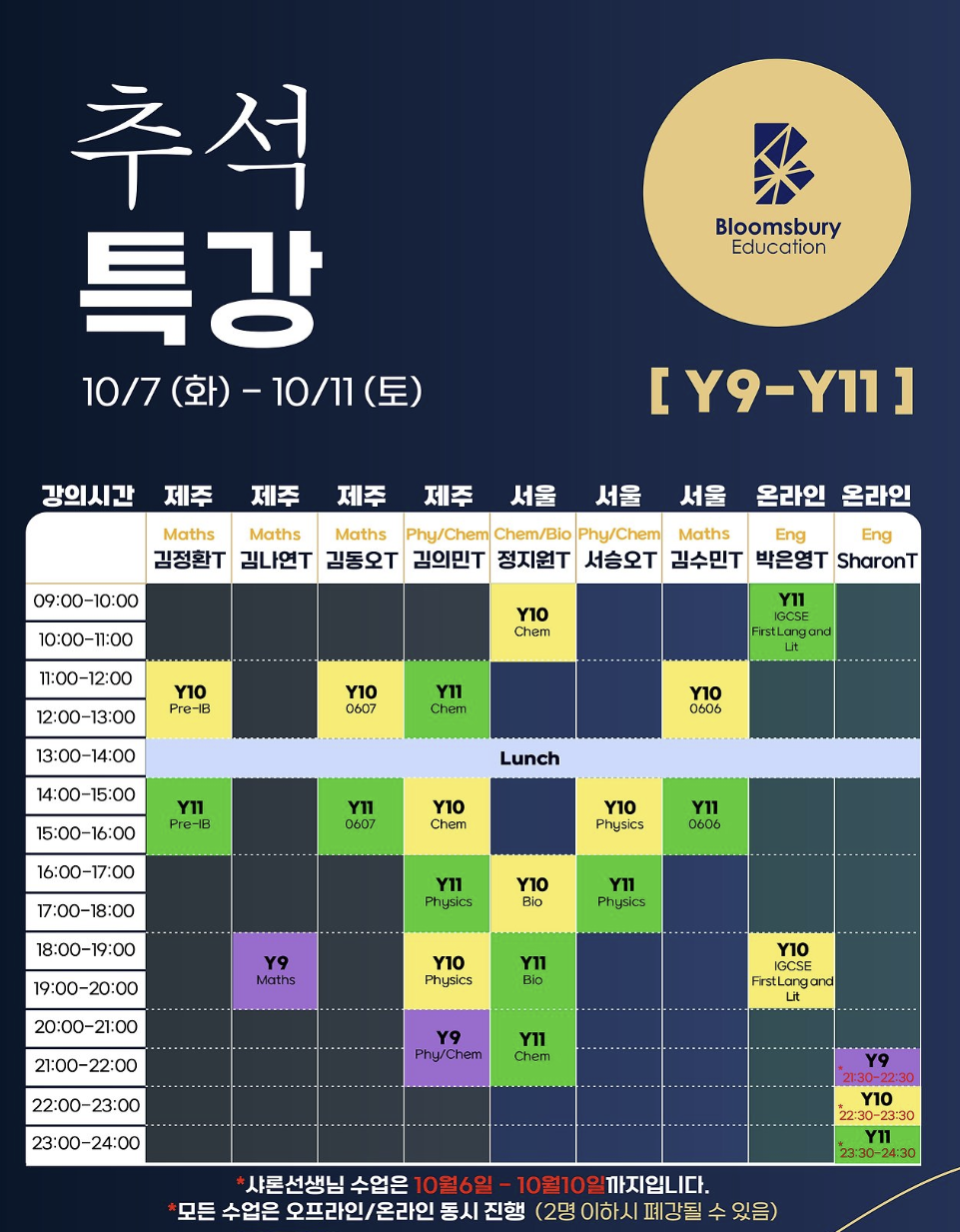 ▶[블룸스/제주&청담] 2025 추석특강 (10/7~10/11) 시간표 (Y9-Y13)